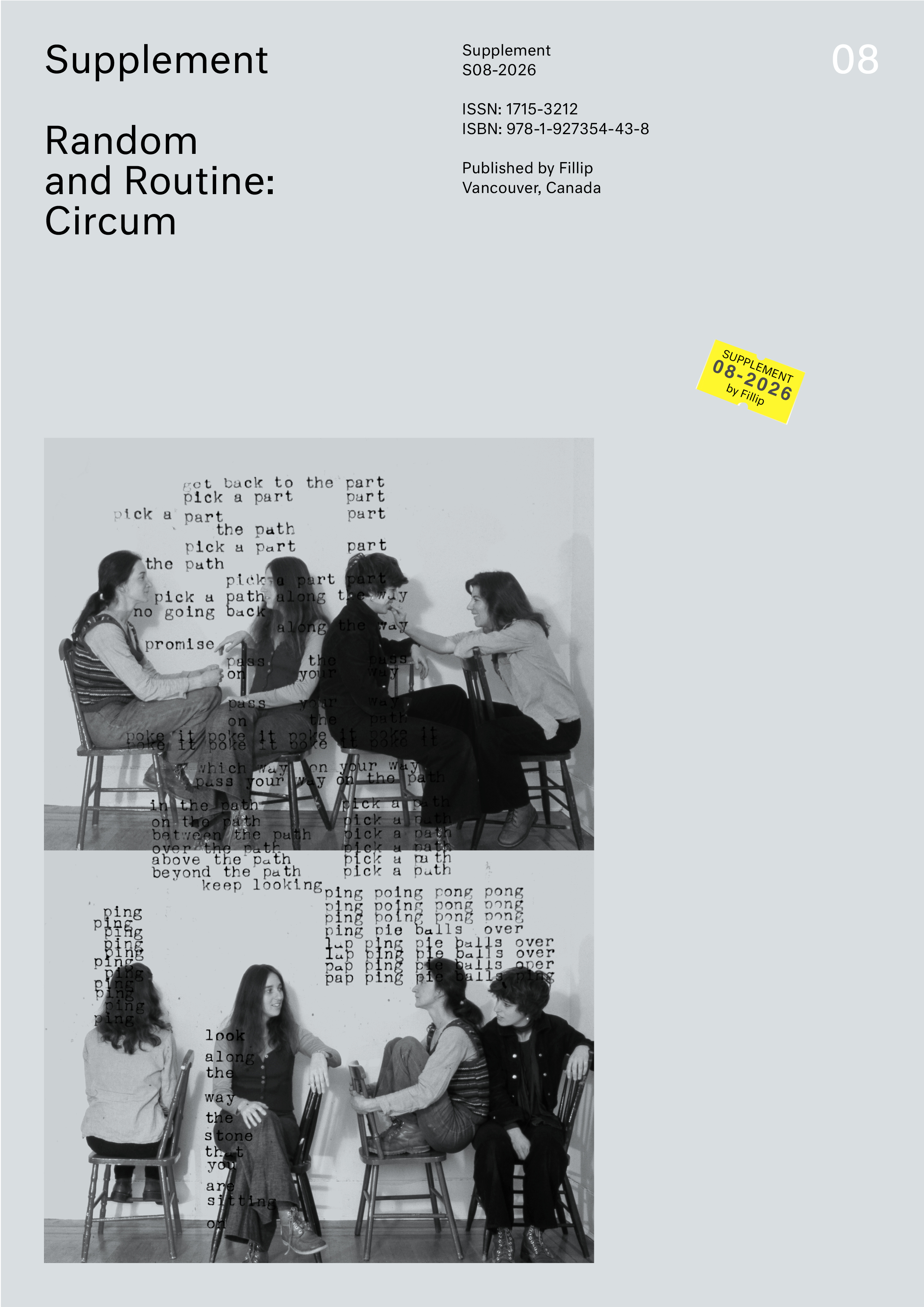 Supplement 8 presents a facsimile score for four voices composed ca. 1975 by the Vancouver artist collective Random and Routine (Carole Itter, Rhoda Rosenfeld, Trudy Rubenfeld, and Cheryl Sourkes) and arranged by Carole Itter. The score is accompanied by an essay by Karina Irvine.
